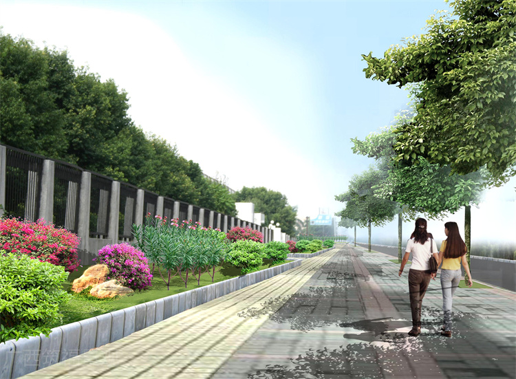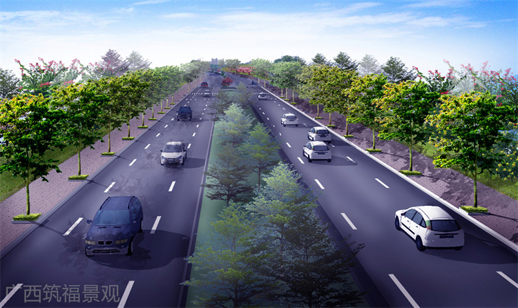 设计以桃花心木为主要行道树,中央绿化带堆坡并种植小叶榄仁林隔绝噪音防止灯光炫目,在十字路口以及重要企业门口则种植开花三角梅以及造型黄金榕,打造一条景观优美的城市主干道。