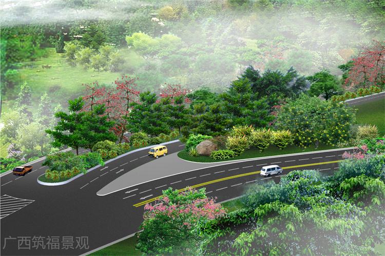 设计以小叶榕为主要行道树,中央绿化带堆坡并种植美丽异木棉、黄槐、鸡冠刺桐、尖叶杜英等营造高中低不同的花林景观,丰富道路景观的同时还能隔绝噪音以及防止车灯炫目。
